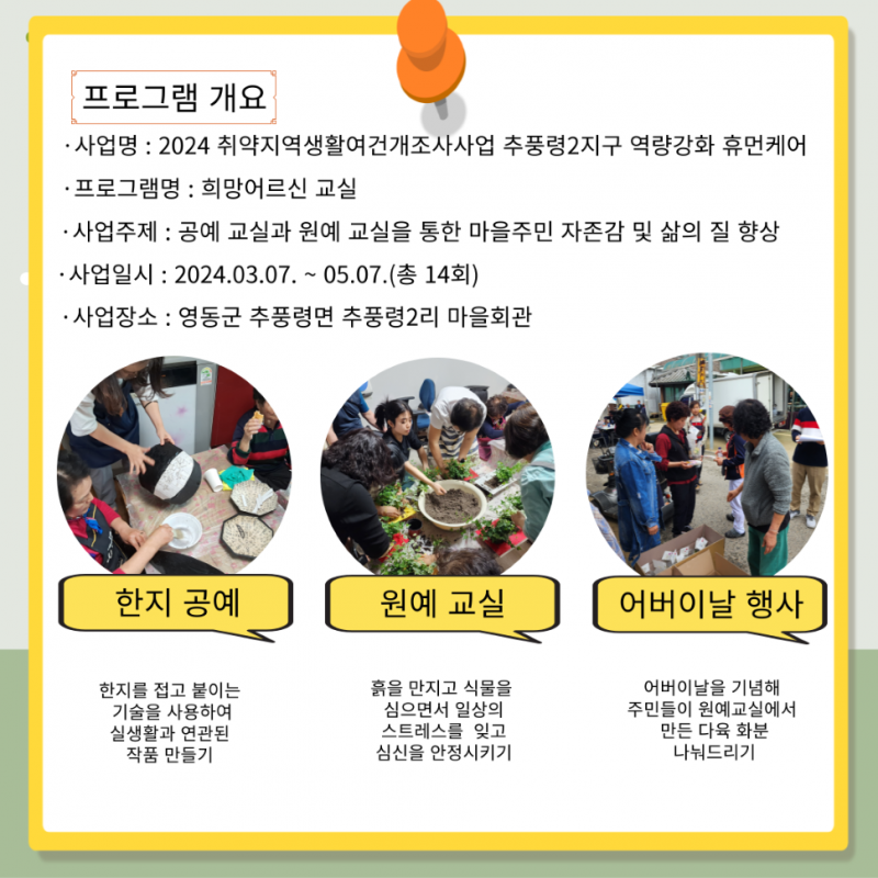 추풍령2리 휴먼케어 희망어르신교실 페이지 정보 작성자 영동군지역활성화센터 댓글 댓글 0건 조회Hit 960회 작성일Date 24-05-20 17:33 본문 목록 이전글취약지역생활여건개조사업_모리주민학교 24.07.29 다음글2023년 황간면 도시재생뉴딜사업 주민공동체활성화 주민제안공모사업 [행복을 꿈꾸는 골목길] 23.12.21