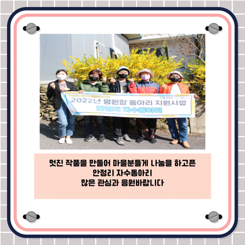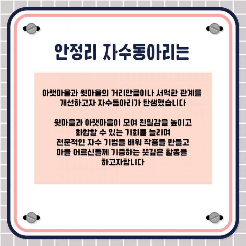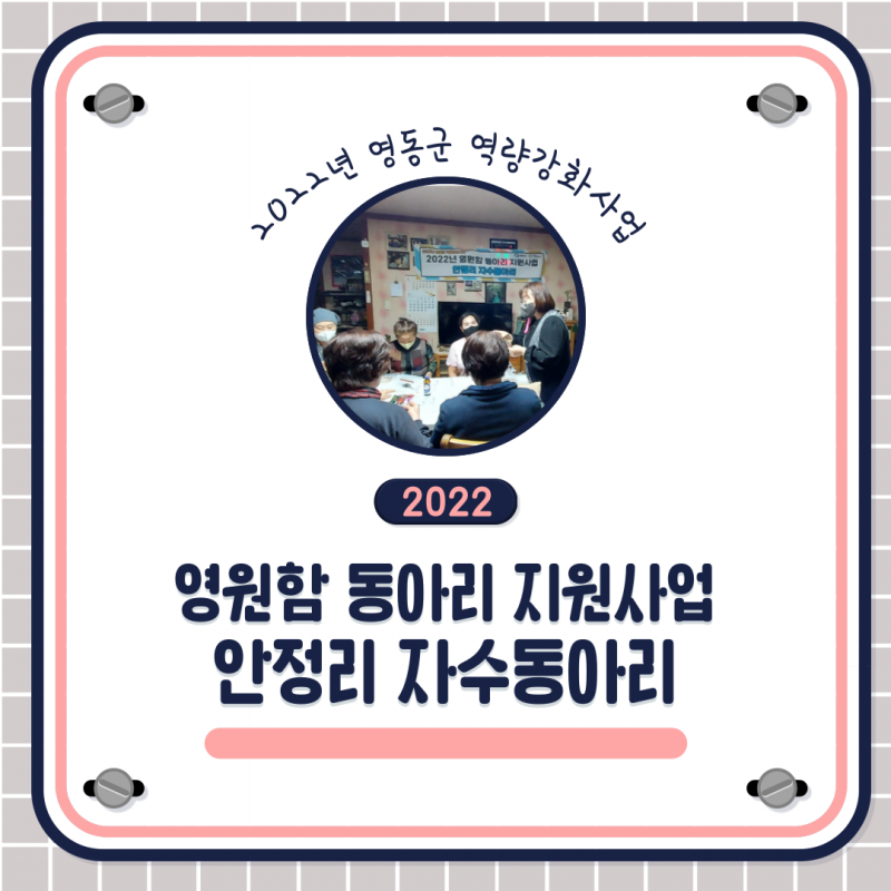 영원함동아리 - 안정리 자수동아리 페이지 정보 작성자 영동군지역활성화센터 댓글 댓글 0건 조회Hit 2,258회 작성일Date 22-04-11 10:49 본문 ♥더 많은 영동의 소식과 이야기를 듣고 싶으시다면?♥ 영동군지역활성화센터 밴드https://band.us/@ydmaeul 목록 이전글[마을기자단] 사랑의 일일찻집 22.07.05 다음글영원함동아리 - 자연을 닮고 싶은 사람들 22.04.11