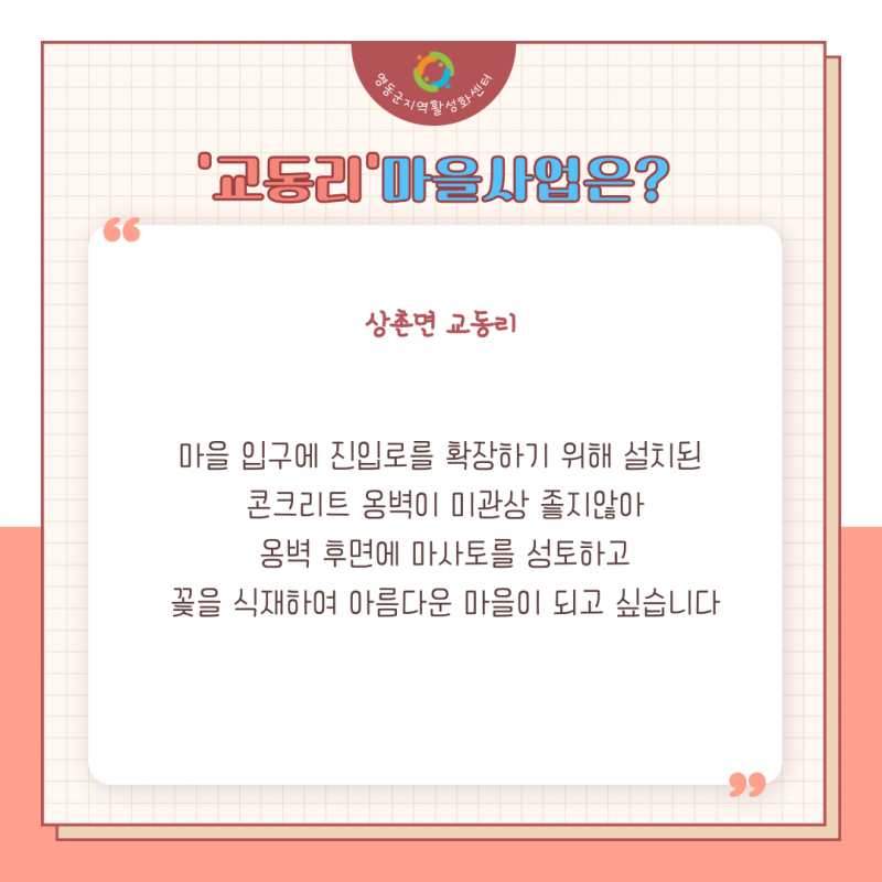 상촌면 교동리 페이지 정보 작성자 영동군지역활성화센터 댓글 댓글 0건 조회Hit 2,783회 작성일Date 22-06-07 11:25 본문 ♥더 많은 영동의 소식과 이야기를 듣고 싶으시다면?♥ 영동군지역활성화센터 밴드https://band.us/@ydmaeul 목록 이전글매곡면 노천중리 22.06.07 다음글추풍령면 추풍령2리 22.06.07