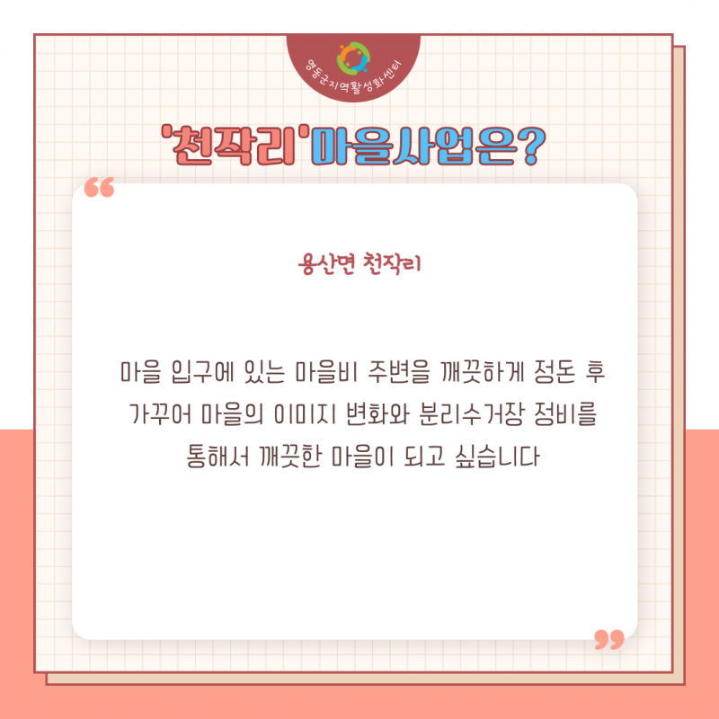 용산면 천작리 페이지 정보 작성자 영동군지역활성화센터 댓글 댓글 0건 조회Hit 2,883회 작성일Date 22-06-07 14:44 본문 ♥더 많은 영동의 소식과 이야기를 듣고 싶으시다면?♥ 영동군지역활성화센터 밴드https://band.us/@ydmaeul 목록 이전글테마발굴워크숍 22.08.01 다음글추풍령면 작점리 22.06.07