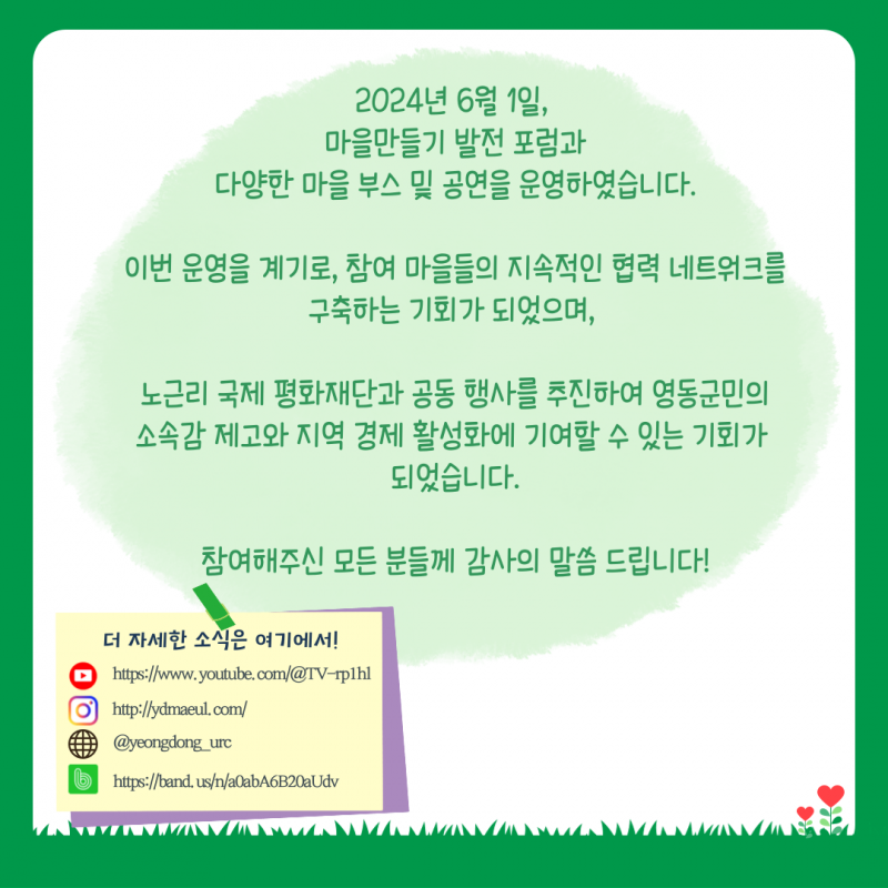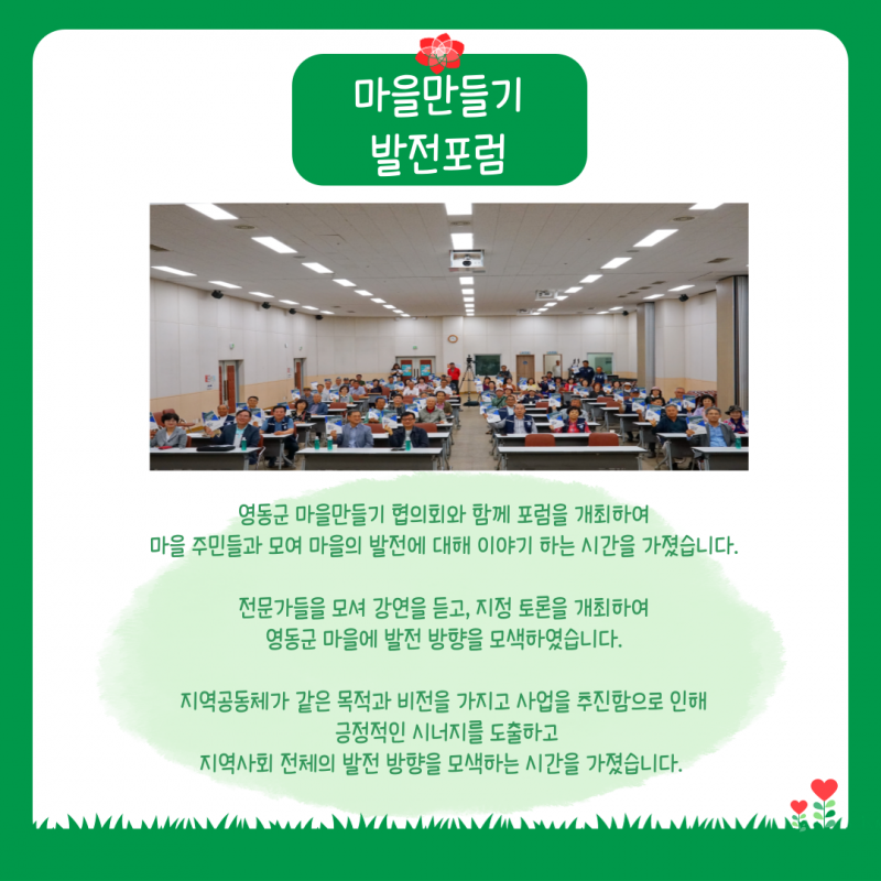 마을만들기한마당 페이지 정보 작성자 영동군지역활성화센터 댓글 댓글 0건 조회Hit 1,549회 작성일Date 24-07-29 10:34 본문 . 목록 이전글2024_영동군 지역활성화센터 합동성과공유회 25.02.24 다음글마을만들기한마당_마을만들기 발전포럼 24.07.29