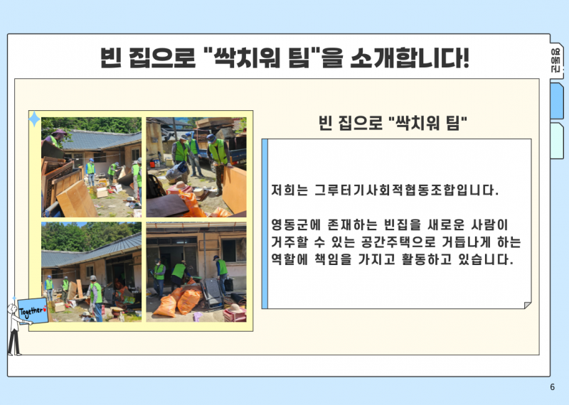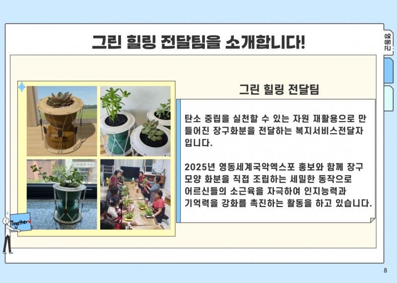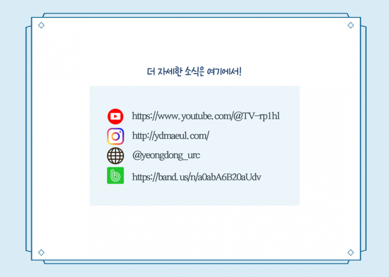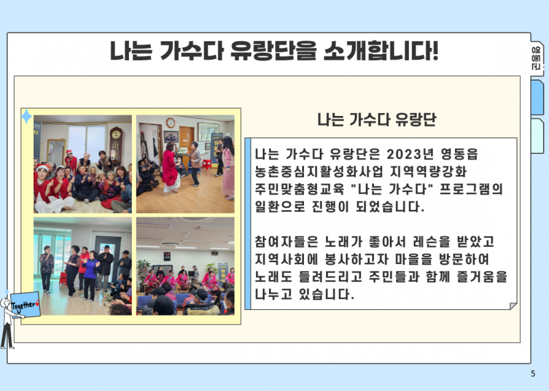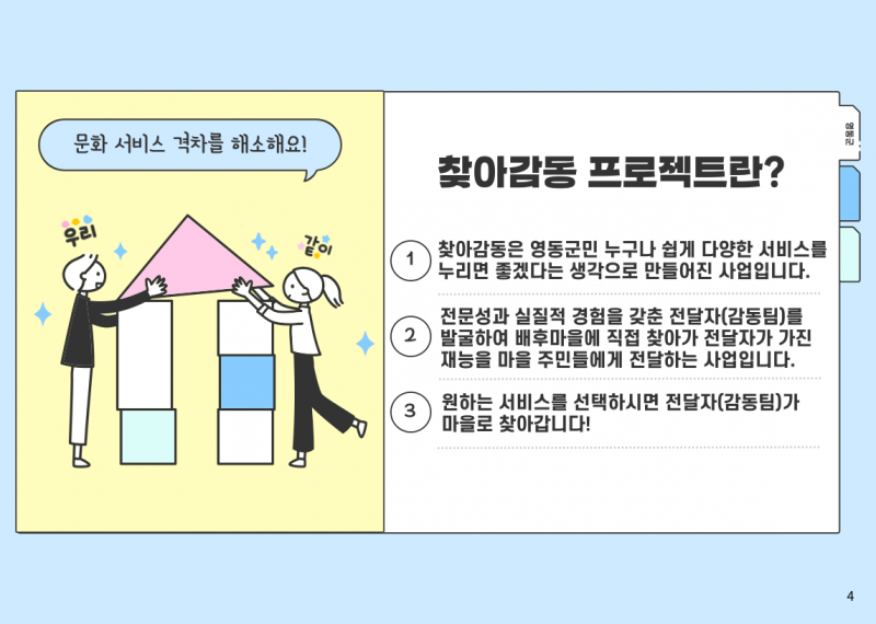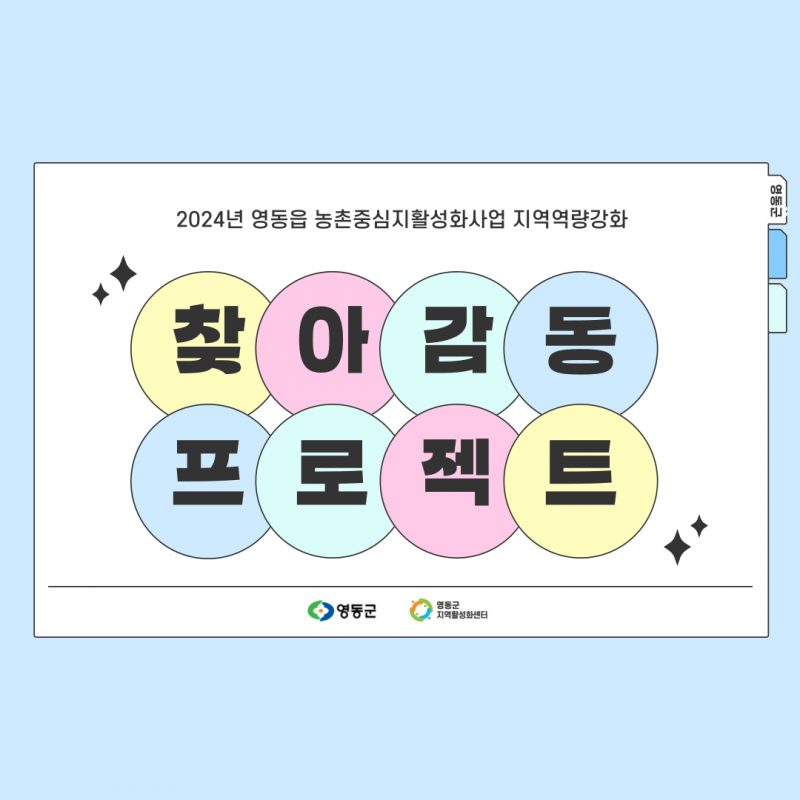 2024 영동읍 농촌중심지활성화사업 지역역량강화_찾아감동프로젝트 페이지 정보 작성자 영동군지역활성화센터 댓글 댓글 0건 조회Hit 860회 작성일Date 24-08-12 09:55 본문 . 목록 이전글2024년 용산면 기초생활거점조성사업 지역역량강화 문화나르미 24.11.21 다음글2024 영동읍 농촌중심지활성화사업 지역역량강화_나는 가수다 시즌2 24.08.12