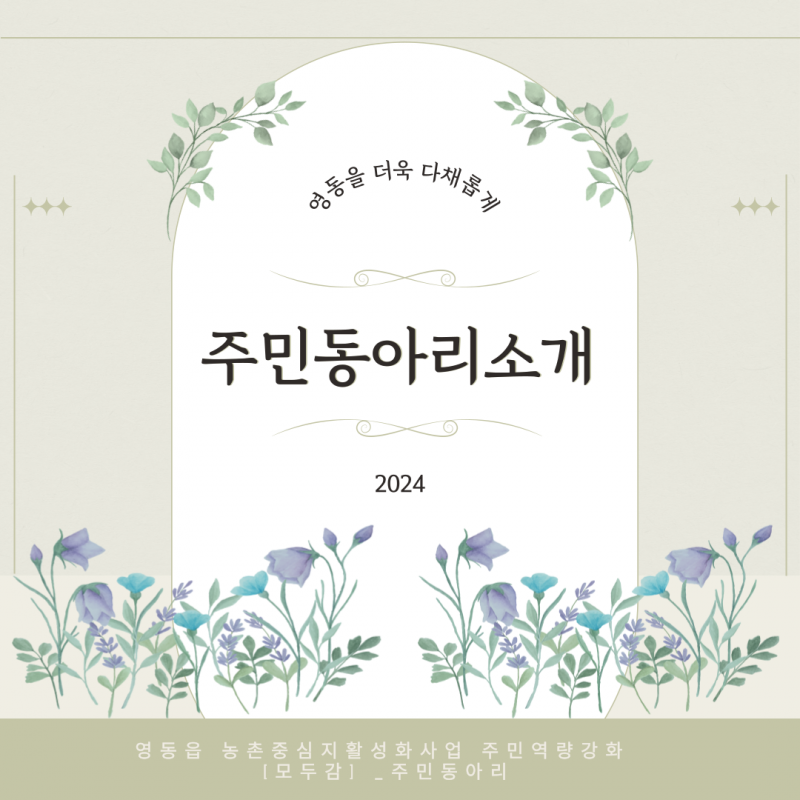 2024 영동읍 농촌중심지활성화사업_주민동아리 페이지 정보 작성자 영동군지역활성화센터 댓글 댓글 0건 조회Hit 414회 작성일Date 25-02-25 09:37 본문 목록 이전글영동읍 농촌중심지활성화사업_함께해영:동네사람들 25.07.16 다음글2024년 용산면 기초생활거점조성사업 지역역량강화 문화나르미 24.11.21