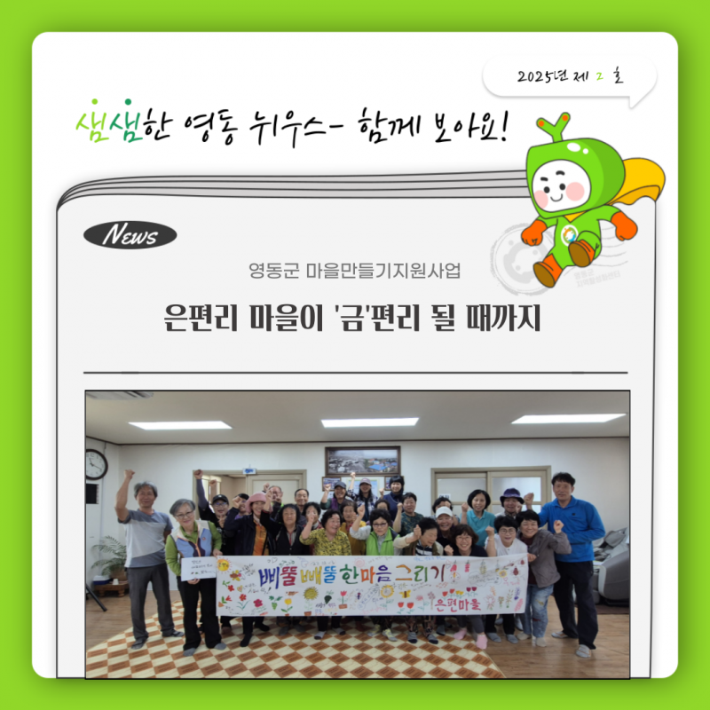 올해 3월부터 은편리 마을은 영동군 지역활성화센터가 주관하는 ‘마을만들기 사업’에 참여해 △마을 환경 개선과 △주민 화합에 힘쓰고 있다. ‘마을만들기’ 사업이란, 주민 스스로가 자기 마을을 살기 좋은 공간으로 만들기 위해 공동으로 추진하는 활동이다. 소득, 체험, 경관, 교육, 문화, 복지, 환경 등 삶의 질 향상을 위한 모든 분야가 여기에 포함된다. 지역활성화센터는 주민 스스로 마을 고유자원을 살려 가치를 증진하고 공동체를 활성화하여 삶의 질을 향상할 수 있도록 지원한다.