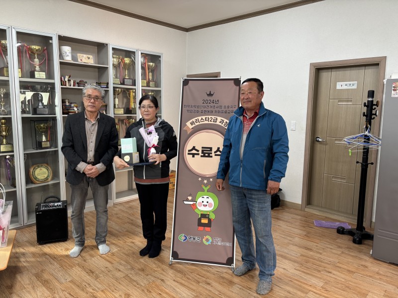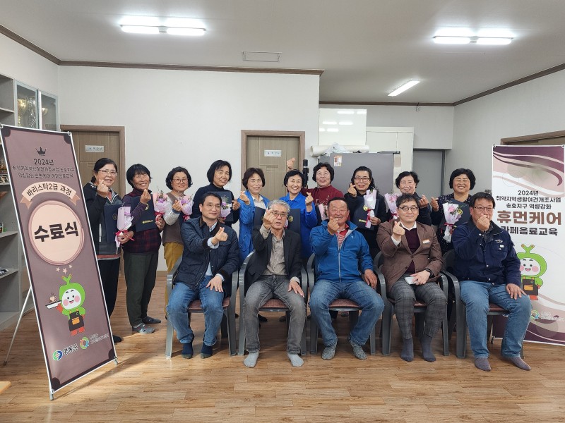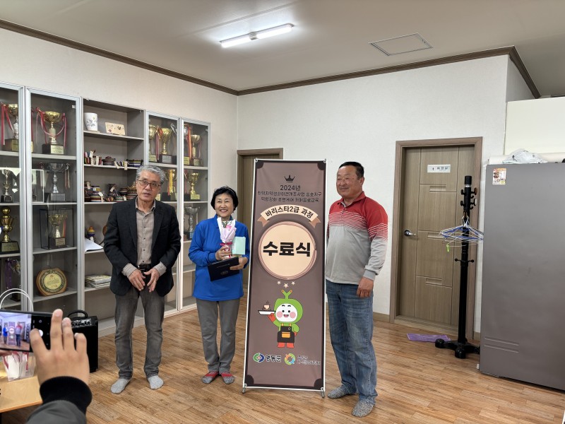 12일 오후 2시 양산면 송호리 복지회관에서 ‘바리스타 2급 과정’ 수료식이 열렸다. 이번 교육과정은 영동군지역활성화센터가 주관한 ‘2024년 취약지역생활여건개조사업 송호지구 역량강화 휴먼케어 카페음료교육’ 일환으로 약 700만원 지원을 받아 진행됐다.
