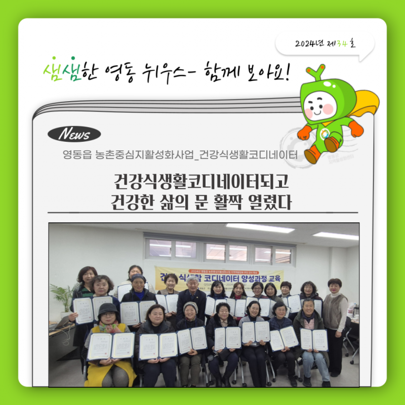 누구나 맵고 짠 음식이 몸에 안 좋다는 사실은 알고 있지만, 건강한 식생활을 실천하는 일은 결코 쉽지 않다. 이곳 영동에서 20여 명의 사람들이 건강식에 대한 관심으로 똘똘 뭉쳤다. 한달간의 교육을 통해 지난날의 식습관을 다시 돌아보고 건강한 식사를 실천하게 되었다는 사람들. 지난달 29일, 지역활성화센터 1층 교육장에서 건강식생활코디네이터 수료식이 열렸다.