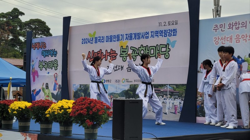 이날 행사에서는 개회식 이후 장영래 추진위원장의 섭외로 노인복지관 시니어앙상블 색소폰연주팀 공연과 함께 정수중학교 학생들의 태권도 시범, 양산면 주민자치프로그램 일환인 숟가락난타팀과 노래교실팀 공연, 영동 출향인 모임인 무지개 하모니카팀 연주, 봉곡리탈출놀이회의 양주별산대놀이 탈춤, 에샘학원의 벨리댄스, 지역가수 초청 공연 등이 진행됐다. 행사 중간에는 주민들과 방문객들이 무대에 올라 노래실력을 맘껏 뽐냈다.