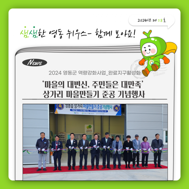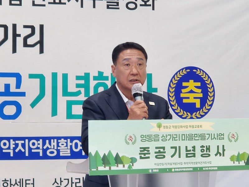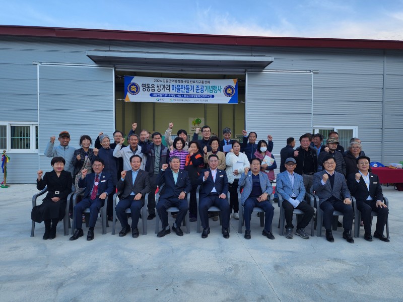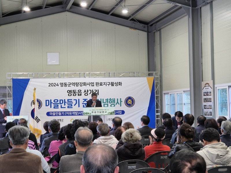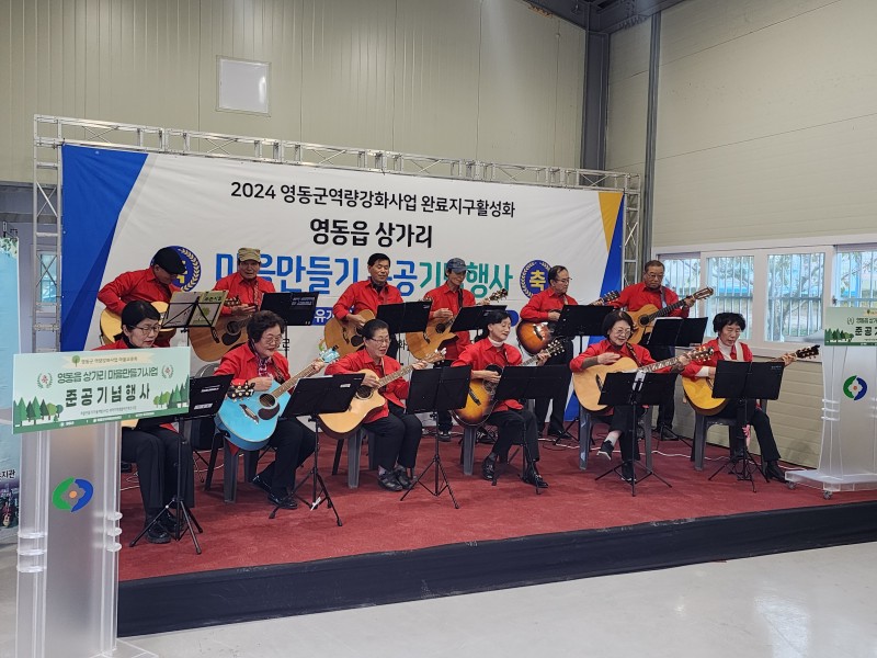 7일 영동읍 상가리 목공방에서 마을만들기 준공 기념행사가 진행됐다. 그동안의 마을 개선 사업 경과를 보고하고 새로워진 마을의 변화를 축하하기 위해 열린 행사에는 지역 주민 및 군 관계자 60여 명이 참석했다. 행사는 푸른시절 통기타 동아리의 축하공연으로 시작해 국민의례, 내빈 축사, 사업 보고, 테이프 커팅식까지 약 1시간가량 진행되었다.