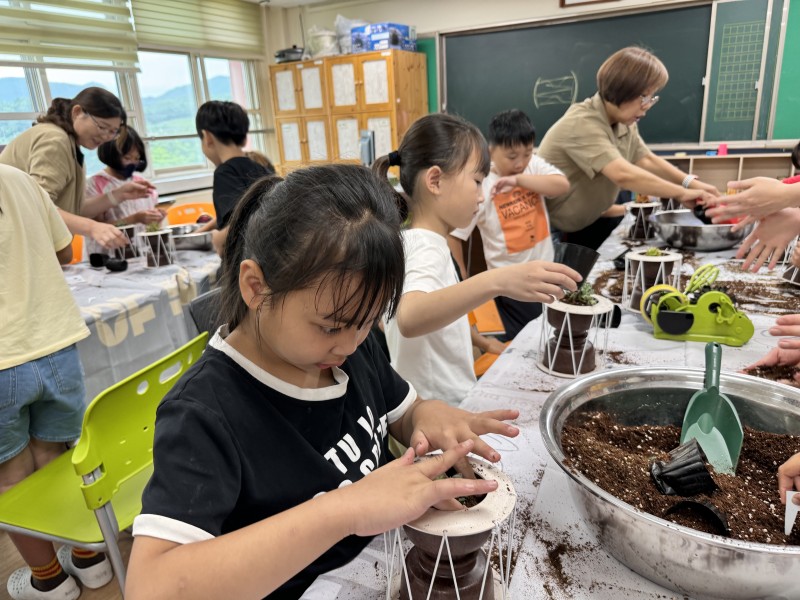 둘째 날에는 한국순환경제협동조합에서 CXP라는 새로운 소재를 소개했다. 탄소를 더 많이 저장할 수 있는 숲을 만들기 위해 숲가꾸기를 하고, 그 부산물을 활용해 플라스틱을 대체할 수 있도록 열가소성을 더해 만든 새로운 소재가 CXP(Cellulose X-linked Polymer)이다. 화분 안에는 동애등에 분변 퇴비를 채워 넣었다. 동애등에는 남은 음식물, 가축분뇨를 분해하여 단백질과 비료를 만들어내어 최근 지구를 재생시키는 역할로 주목받고 있는 곤충이다. 환경을 살리고 자원을 활용하는 다양한 방법에 대해 배우며, 영동군의 아이들에게 맞추어 제작한 장구모양의 화분으로 지역의 정체성을 공유하는 시간이었다.