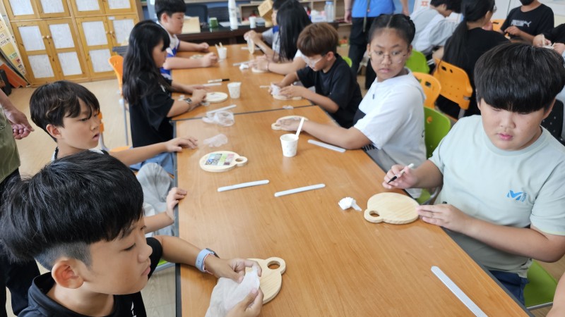 첫 날, 영동읍 상가리(이장 : 박동하)의 마을 공방인 가리농임업에서 구룡초를 방문했다. 강사는 우리 숲에서 건강하게 키운 잣나무 집성재 큐브를 들고 광합성을 통해 나무에 저장될 수 있는 탄소의 양을 설명하며 수업을 시작했다. 탄소를 감축하는 목재의 소중함을 배우고 나무 냄비 받침 재료를 받아든 아이들은, 사포질부터 꼼꼼하게 시작하여 나무판을 다듬고, 타일을 채워 넣어 자신만의 작품을 완성했다.