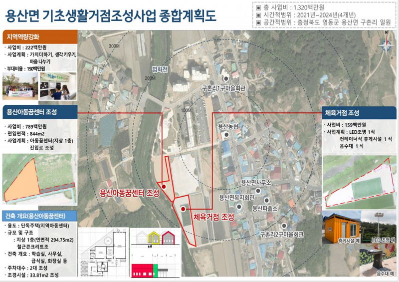 기초생활거점조성사업은 365생활권을 조성하기 위해 읍·면소재지를 거점지로서의 기능을 보완하고, 문화·복지 등 생활 인프라를 마련하여, 배후 마을로 서비스가 이어지도록 하는 사업이다. 용산면에서는 2021년부터 2024년까지 용산아동꿈센터조성, 체육 거점 조성 등의 사업을 진행 중이며, 영동군 중간지원조직인 지역활성화센터에서는 이 사업의 성과를 잘 이어나갈 수 있도록 지역역량강화 사업을 지원하고 있다. 또한 지역 주민과 아동 간 소통을 통한 상호 교류 학습의 장을 마련하고, 배후 마을 주민의 문화 복지 사각지대 해소할 수 있는 다양한 문화 복지 프로그램 운영, 주민 참여형 돌봄 및 나눔 봉사 프로그램 운영으로 주민 공동체를 활성화하기 위한 노력을 지원한다.