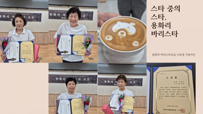 2023년 영동군 농촌유휴시설활용 지역활성화사업으로 선정돼 특화프로그램의 하나로 진행된 이번 바리스타 교실은 용화리 부녀회원 17명이 참여해 필기, 실기검정을 거쳐 조합원 전원이 바리스타 2급 자격증 취득에 성공했다.