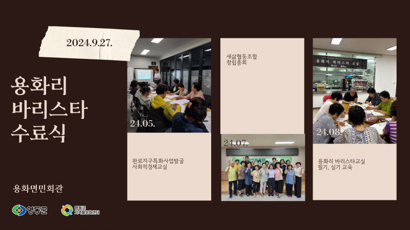 새삶 협동조합 이효자 이사장은 “사업 시작부터 바리스타가 되기까지 용화리 부녀회원들이 합심해서 성과를 낼 수 있었다”며 “앞으로도 초심을 잃지않고 끝까지 함께 할 수 있기를 기원한다”고 밝혔다.