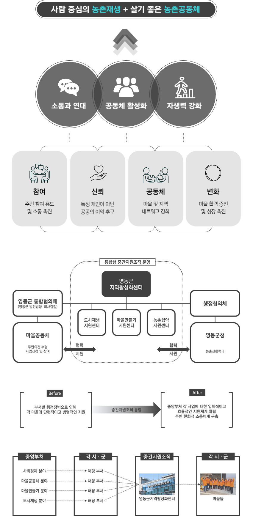 2021년 7월 농촌협약 체결 및 시범지구 채택됨에 따라 영동군 농촌협약 사업의 효율적 추진과 더불어 지역사회 역량강화, 지역공동체 활성화 등을 통해 지속가능한 지역발전을 도모하기 위하여 설립된 중간지원조직